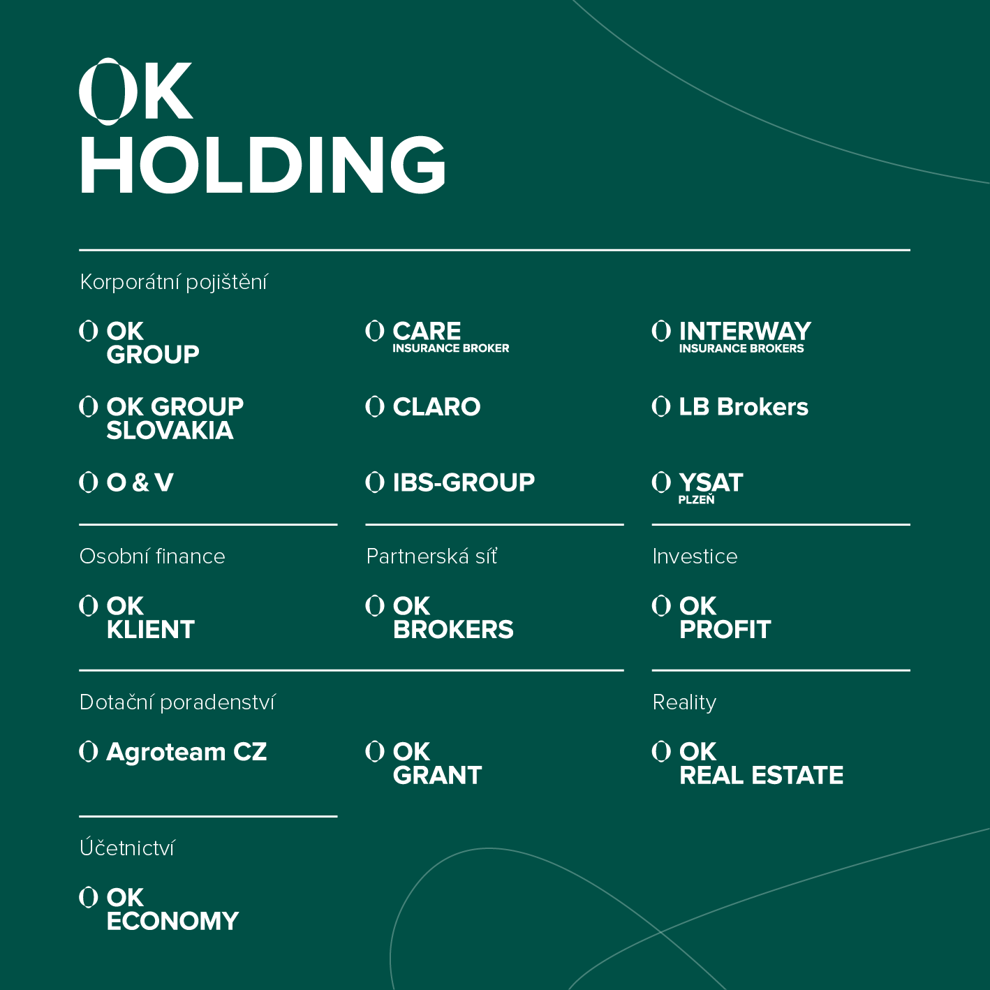 OK HOLDING je jedinečný koncept spolupráce mezi profesionály ve svých oborech. Jedná se o uskupení majetkově propojených společností, jejichž prostřednictvím nabízíme rozmanité spektrum služeb, a to v oblasti pojišťovnictví, finančního, dotačního a ekonomického poradenství. Vlastní, léty získávané, profesní zkušenosti jsme transformovali v ucelenou nabídku služeb pro naše klienty.